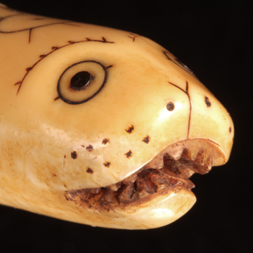 This folktale is perfectly expressed in this finely modeled and cleverly designed variation on a needle case. The head pulls off, acting as a lid for the container, and is perfectly carved to fit almost seamlessly onto the body, which is hollowed out to fit the needles in its cavity (a number of its original ivory needles are still inside). The smiling seal head shows off exactingly carved teeth, and the animal is shown in the typical swimming / flying position seen in many other representative examples.